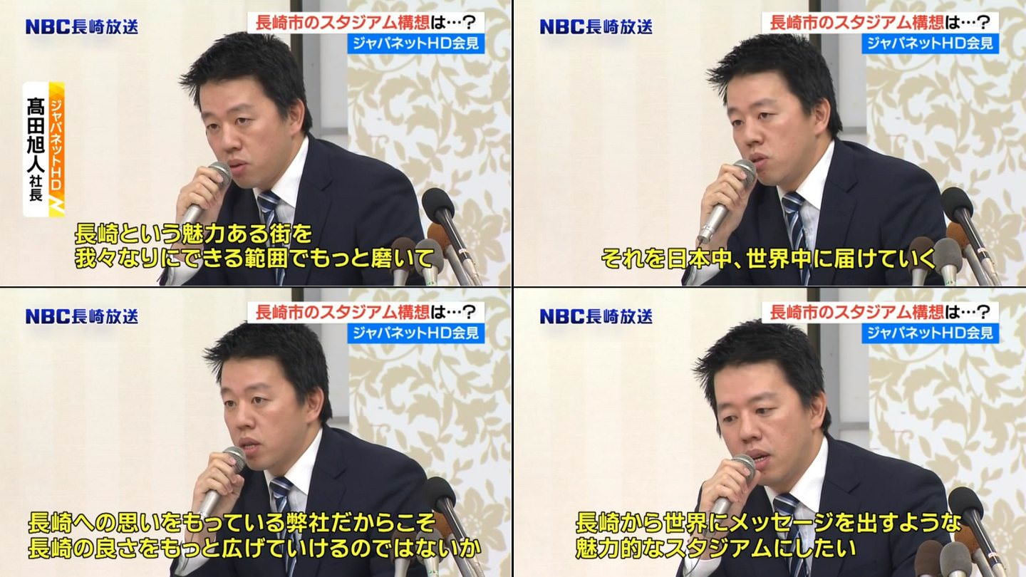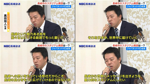 高田社長は「この話(長崎造船所幸町工場一帯の跡地活用事業)が出てきたのは運命的」としたうえで、「長崎をもっとワクワクする街にし、長崎県が一体になって魅力を発信できるようになるために、ジャパネットHDがリスクを取る」として、約500億円の建設費はジャパネットHDがすべて負担する考えであることを明らかにした。