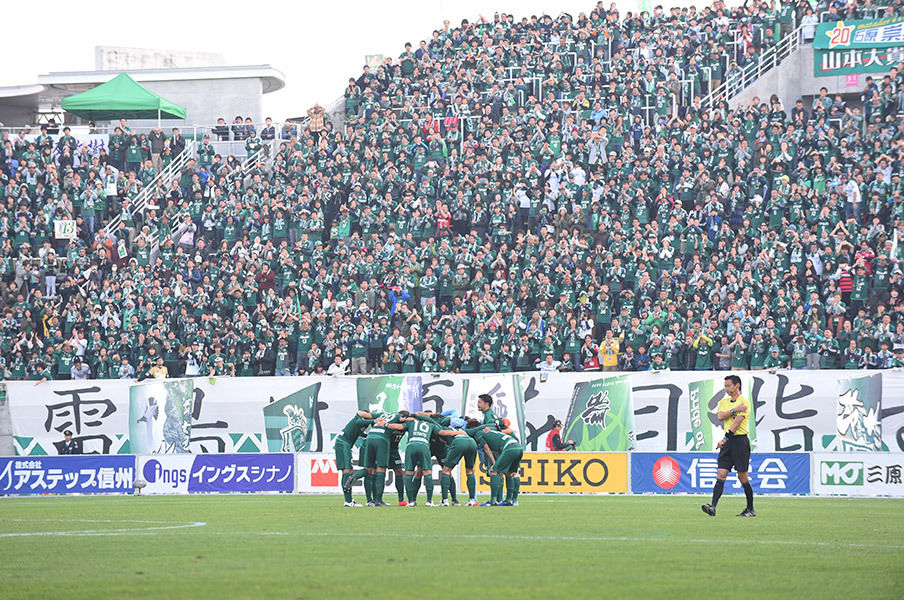 試合後のセレモニーで、北信越1部時代の2009年からチームを支えた鉄戸裕史選手(34)が引退を表明。スタンドのあちこちから「ありがとう」との声が上がり、鉄戸選手の応援歌が繰り返し歌われた。松本市の会社員中島大輔さん(29)は「鉄戸選手は地域リーグの頃からチームを支えてくれた。何らかの形でクラブに加わってくれればうれしい」と話していた。